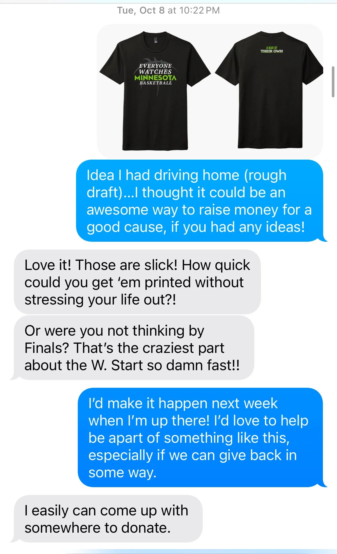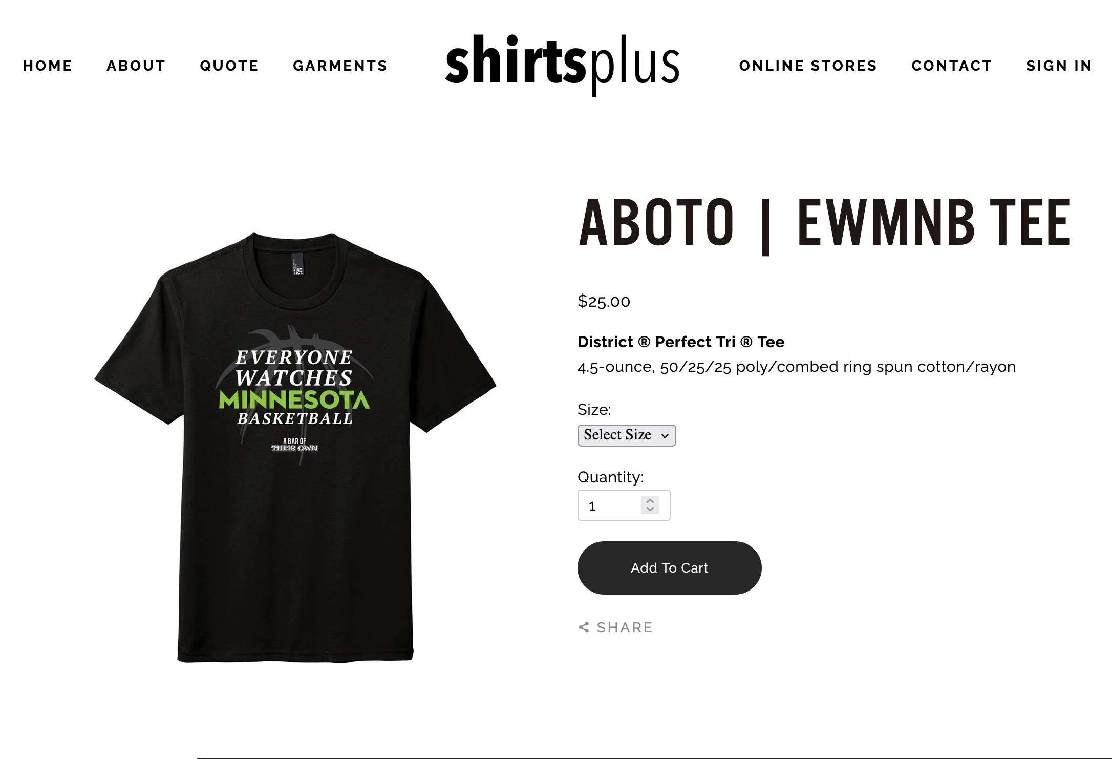 Taking a cue from the "Everyone Watches Women's Sports" tee, I had a lightbulb moment - why not make an "Everyone Watches Minnesota Basketball" tee and channel all this excitement into something meaningful? I teamed up with ABOTO and we got the ball rolling.